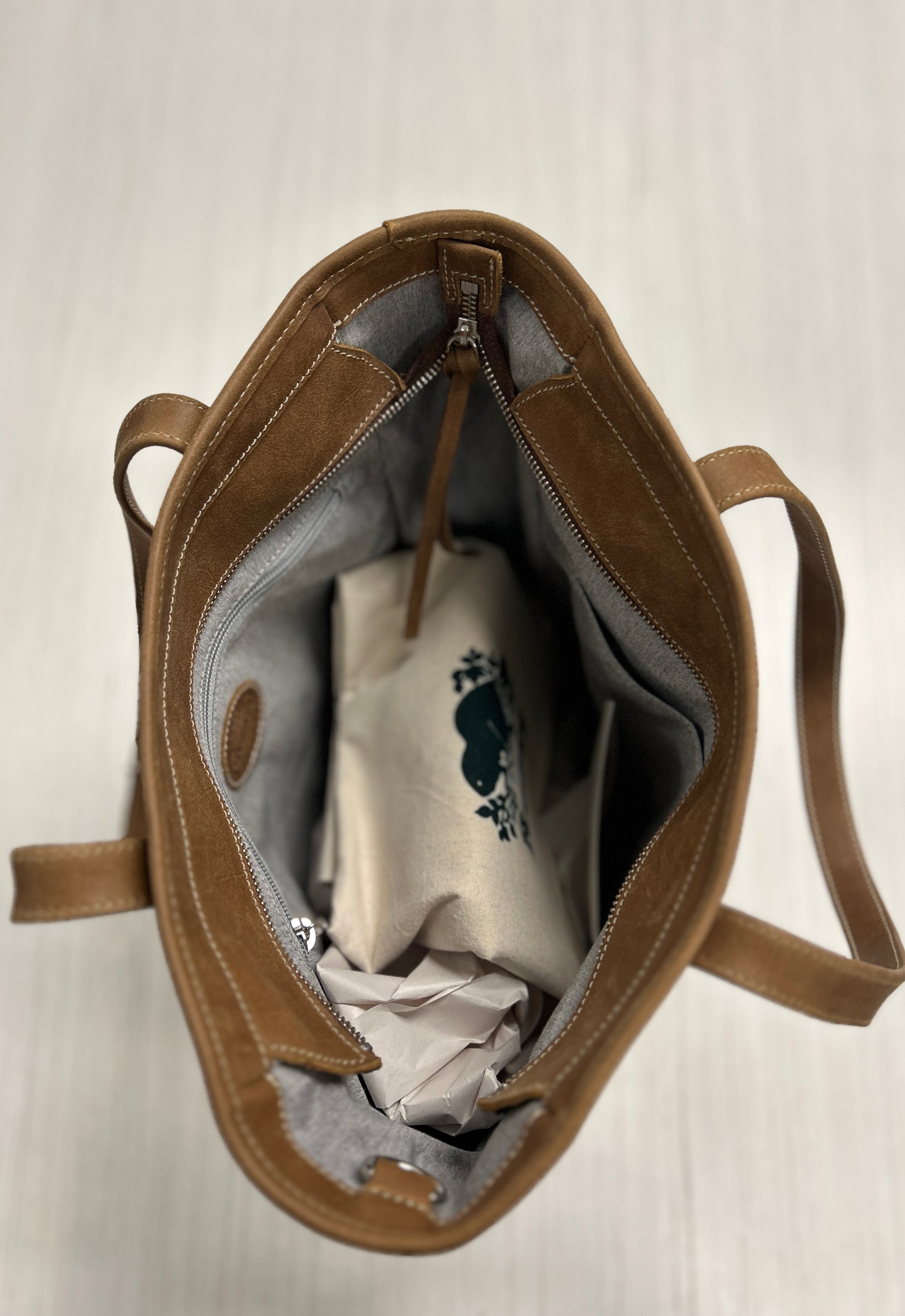 This stylish French Pocket Tote features a main compartment with no top closure and an interior zip-hanging pocket. Designed and handcrafted in Canada, it’s a stylish and functional piece with a tassel detail on the handle.