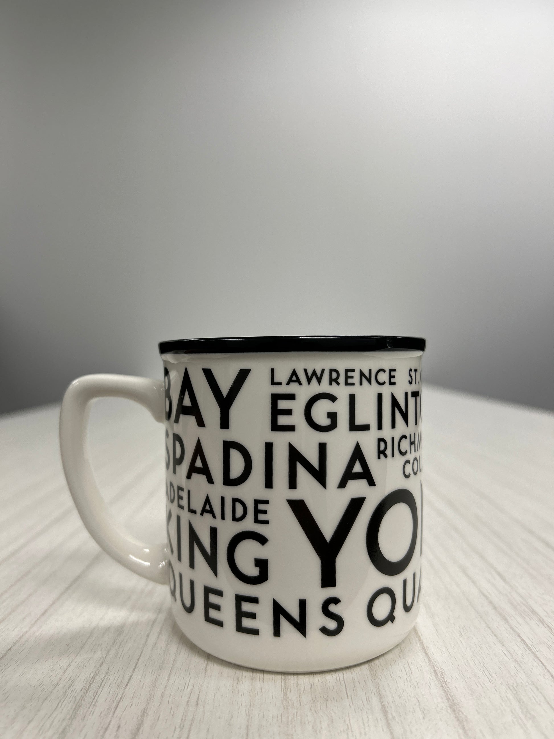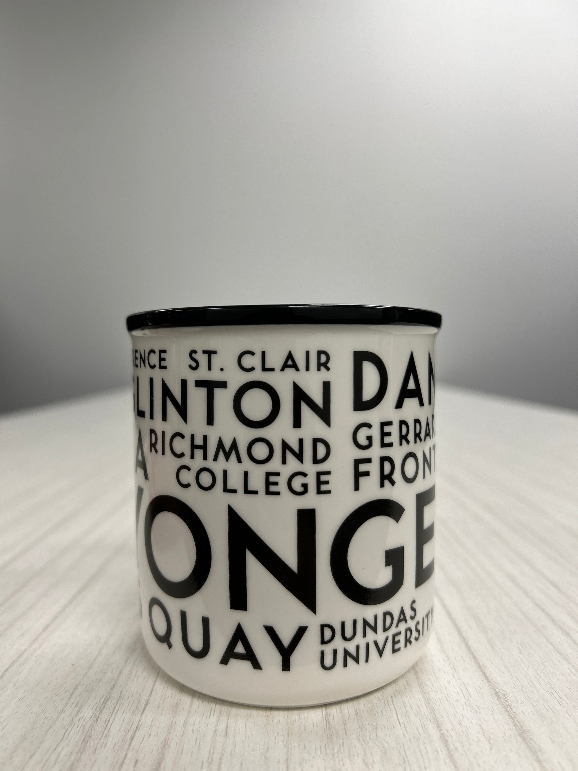 MUG: Bring a taste of Toronto to your morning coffee or tea with this fun Toronto Streets Mug. Inspired by vintage maps and photographs – features a word-collage of Toronto’s most well-known streets and avenues in a bold black typeface that matches the style of Toronto’ venerable transit system.