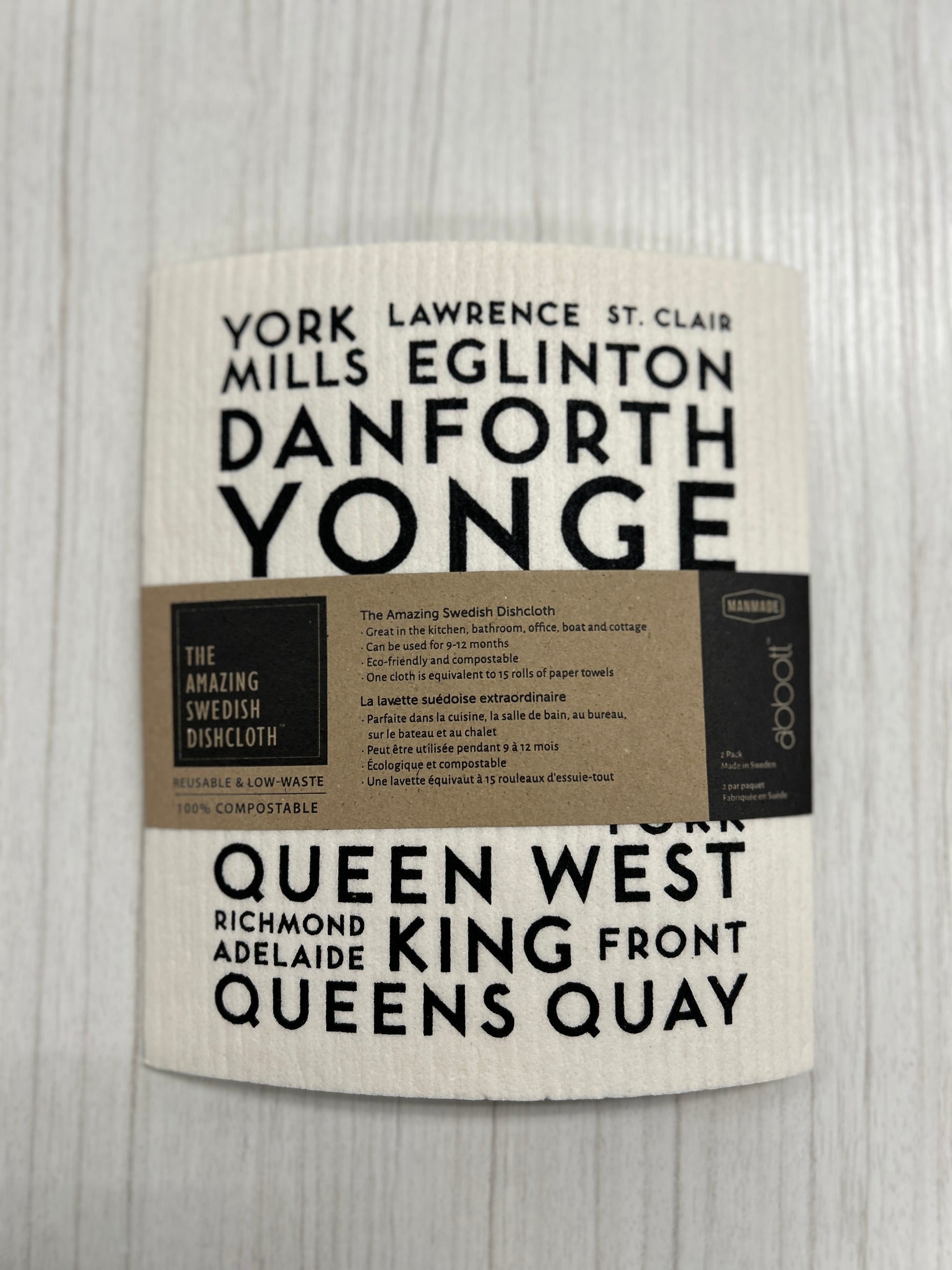 DISHCLOTH: An homage to the streets of Toronto, ManMade Art has designed these bold dishcloths using a typeface reminiscent of TTC signage.
